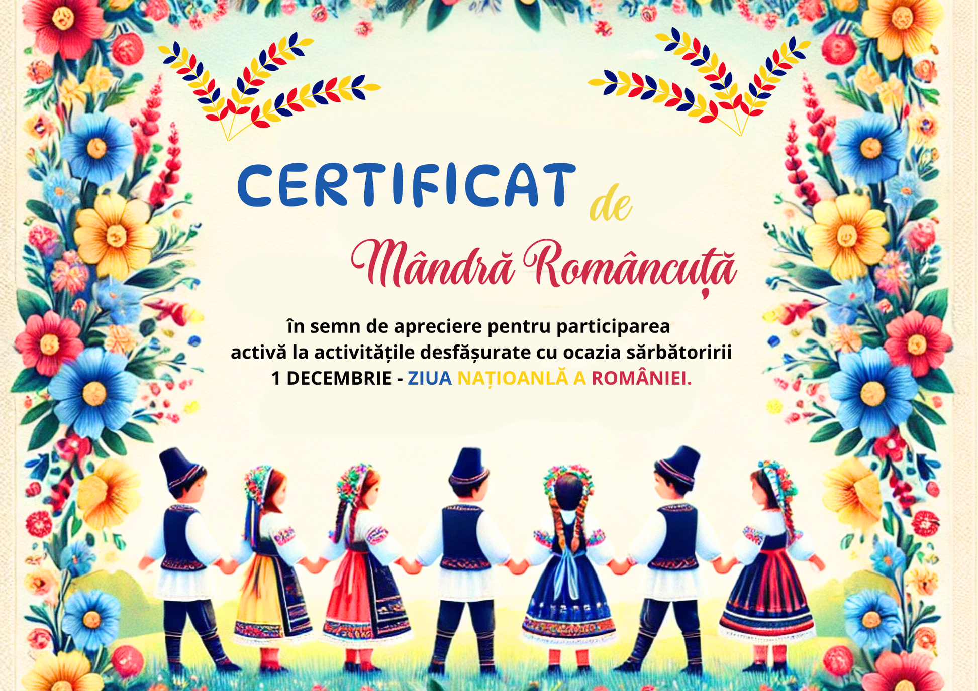 Diplome festive dedicate Zilei Nationale a Romaniei, perfecte pentru activitatile, serbarile si proiectele tematice din gradinita si scoala. Modelele sunt colorate, atractive si gata de personalizat cu numele fiecarui copil.