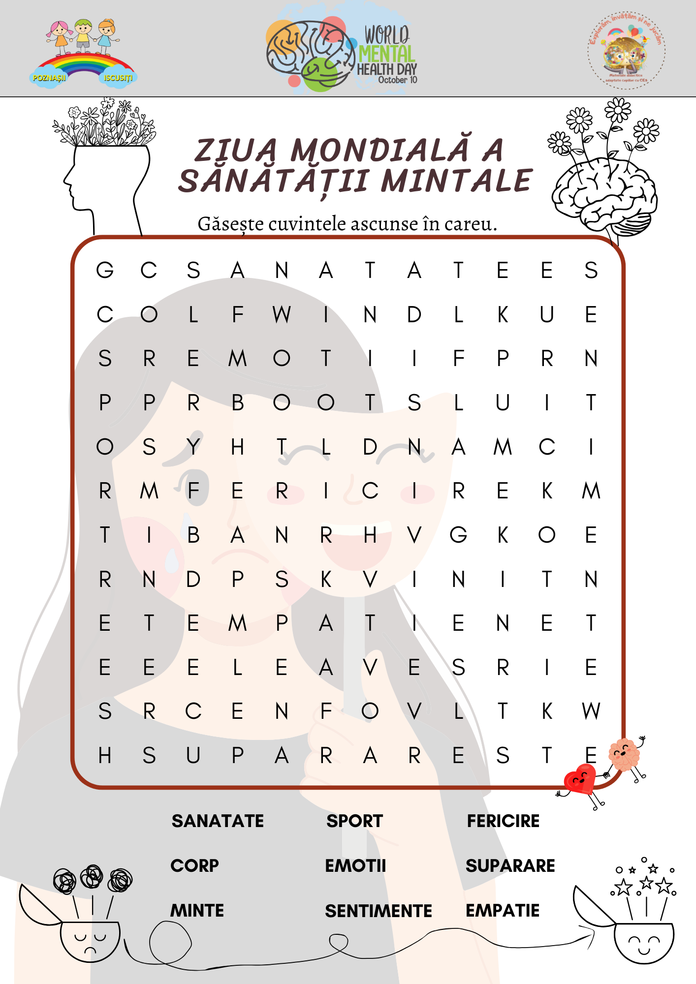 Celebrează această zi importantă cu o fișă de tip „word search” care îi ajută pe copii să descopere concepte-cheie precum emoții, empatie, fericire, sănătate, sport. Activitatea dezvoltă vocabularul emoțional, atenția și concentrarea, fiind potrivită pentru clasă sau cabinetul de terapie.