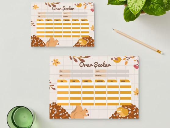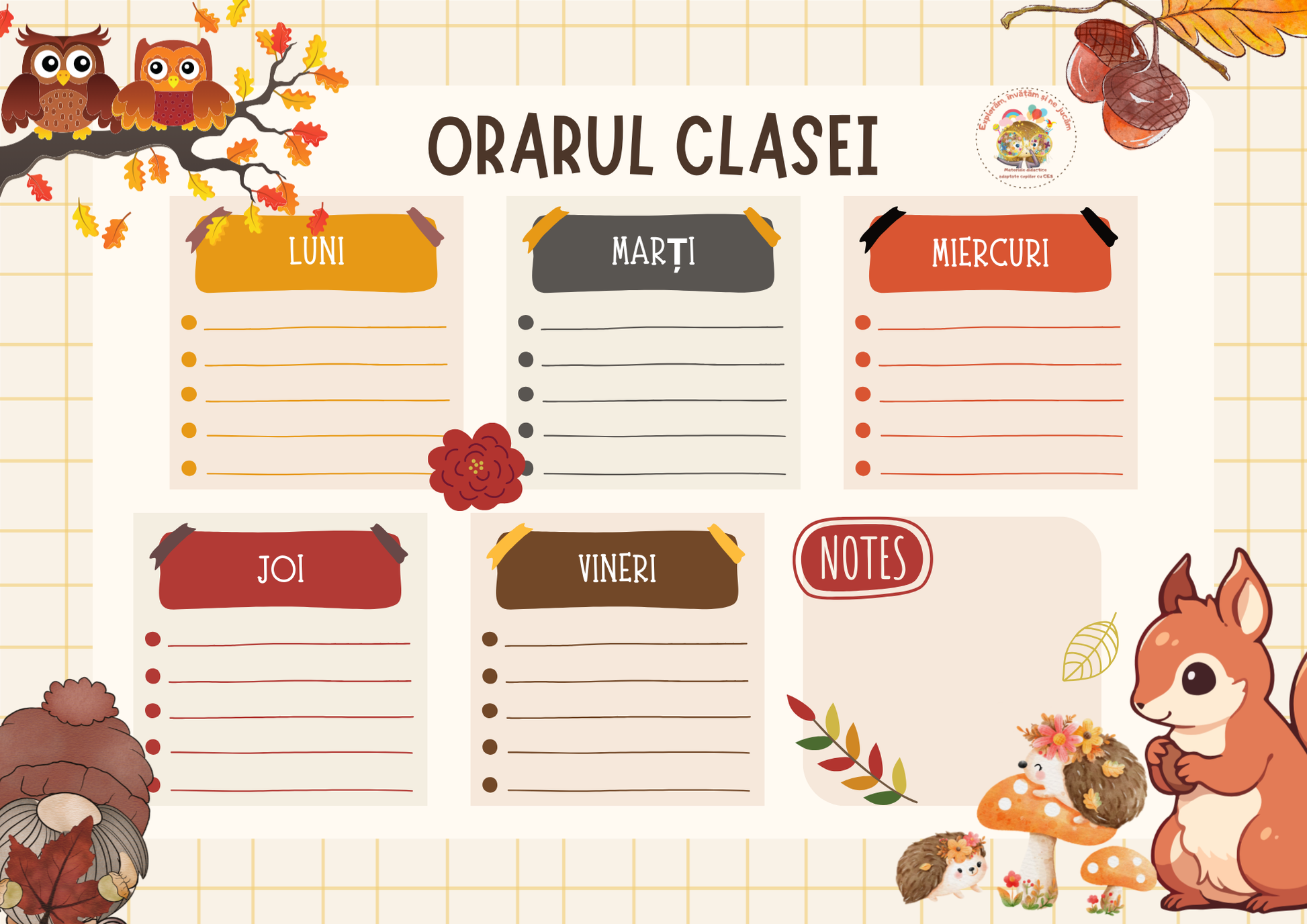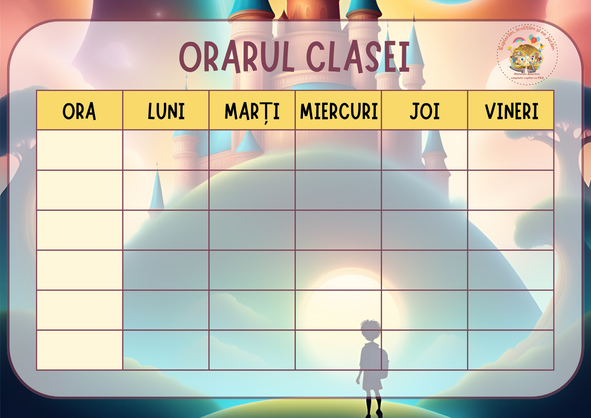 Un material gata de folosit pentru organizarea zilnică a copiilor. Pot fi completate cu materiile și activitățile școlare și afișate în clasă sau acasă.